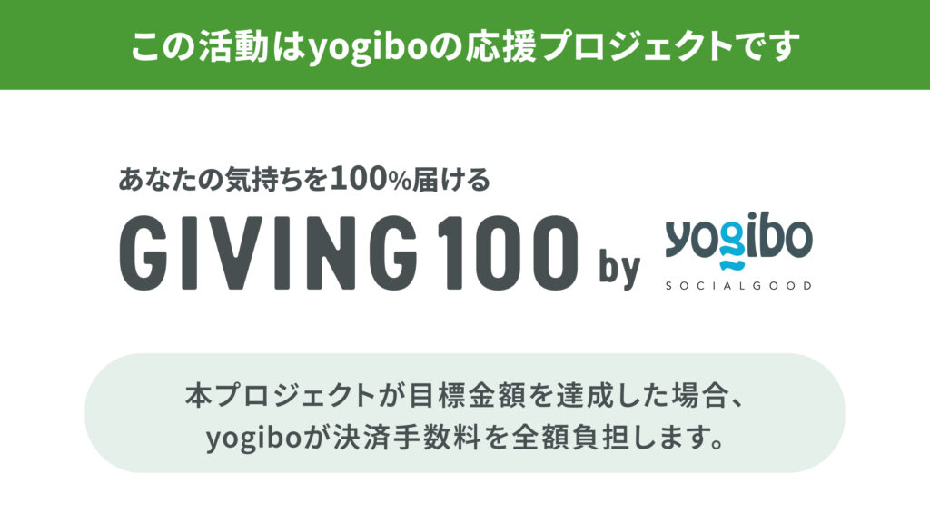 当クラウドファンディングは、寄付決済サービスのコングラントが提供する寄付金が100%届くクラウドファンディング「GIVING100 by Yogibo(ギビングハンドレッド)」です。