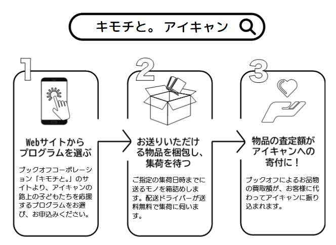 ブックオフコーポレーションとの連携で、不要品の買取額が団体への寄付となるプログラムです。読み終えた本や、聴かなくなったCD、遊び終わったゲームなどをお送りいただくと、その買取額が寄付となり、アイキャンの活動に役立てられます。