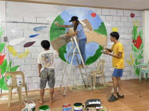 翌週、子どもたちは、スタディツアーで訪れた方々に「この部分は僕が描いたんだよ」等と見せ、誇らしげにしていました。自分が描いたもの、頑張った成果を人に見てもらい、褒めてもらえるという経験は、また一つ子どもたちの自信につながったと思います。壁に絵を描くという大胆な作業でしたが、やってよかったと思いました。