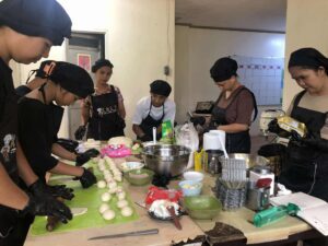 路上教育の新たな担い手となるべく研修を受けている「次世代カリエ」のメンバー15名は、カリエのビジネスであるパンやチップスを作れるようになるための訓練も受けています。目的は、技術の習得によって彼らに収入の機会をつくることだけではありません。基本的な衛生や食品管理の知識を身につけたり、時間やルールを守って作業することや分担・協力することの大切さを知ったりと、社会で生きていくための基礎的な「力」をつけることです。